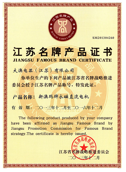 热烈祝贺由大澳电机(江苏)有限公司荣获“江苏名牌产品” 2014.07.25