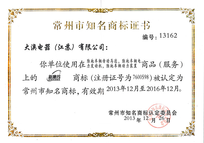 热烈祝贺由大澳电机(江苏)有限公司荣获“常州市知名商标证书”